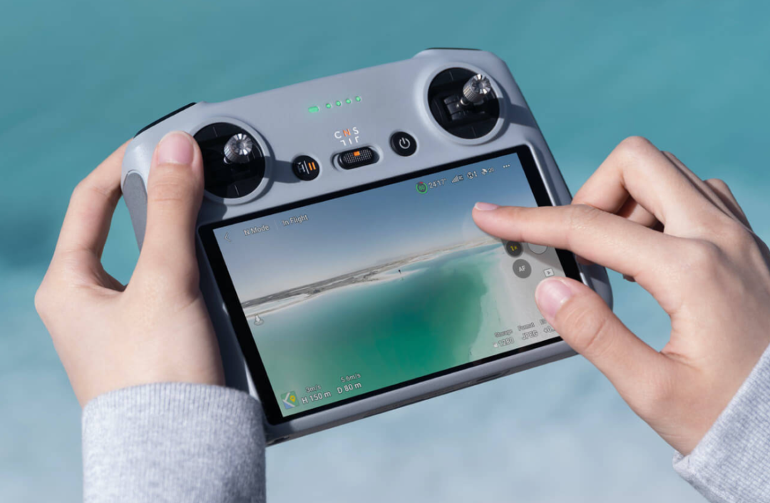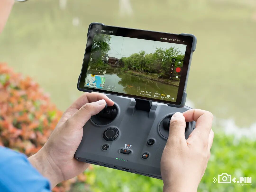 而到了这一代,好家伙,大疆不仅给遥控器用上了一块 7 英寸 Mini-LED 大屏,而且它还把屏幕和摇杆也设计成了可折叠的结构,当你把屏幕掰上去的时候,底下摇杆也会跟着一起升上来,真正做到了开机即用。