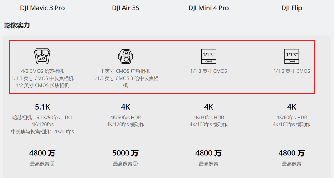 而在影像这块,刚开始无人机普遍只有一颗摄像头,发展到后面,大疆开始给消费级无人机用上了双摄甚至三摄系统,包括摄像头传感器尺寸,也从最初的小底一路狂飙,来到了现在的 1 英寸甚至 4/3 英寸。